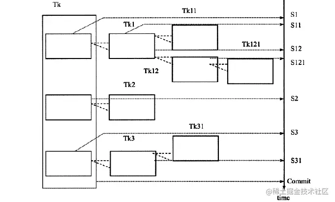 3)位于根节点的事务成为顶层事务,其他事务成为子事务。事务的前驱(predecessor)为父事务(parent),事务的下一层成为儿子事务(child)