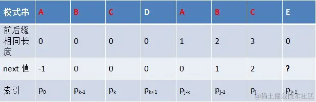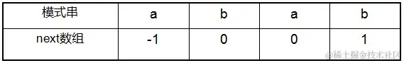 - next 数组考虑的是除当前字符外的最长相同前缀后缀,所以通过第①步骤求得各个前缀后缀的公共元素的最大长度后,只要稍作变形即可:将第①步骤中求得的值整体右移一位,然后初值赋为-1,如下表格所示: