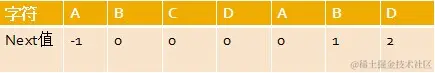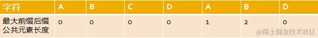 由上文,我们已经知道,字符串“ABCDABD”各个前缀后缀的最大公共元素长度分别为: