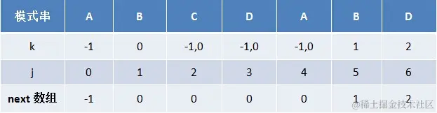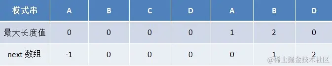 换言之,对于给定的模式串:ABCDABD,它的最大长度表及next 数组分别如下: