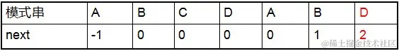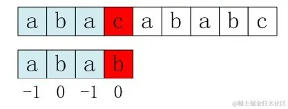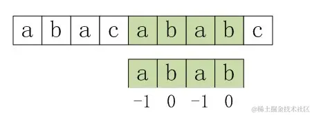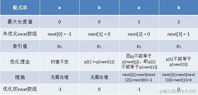 利用优化过后的next 数组求法,可知模式串“abab”的新next数组为:-1 0 -1 0。可能有些读者会问:原始next 数组是前缀后缀最长公共元素长度值右移一位, 然后初值赋为-1而得,那么优化后的next 数组如何快速心算出呢?实际上,只要求出了原始next 数组,便可以根据原始next 数组快速求出优化后的next 数组。还是以abab为例,如下表格所示: