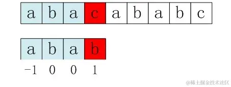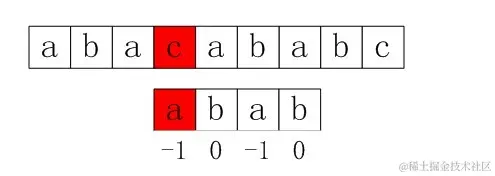 比如,如果用之前的next 数组方法求模式串“abab”的next 数组,可得其next 数组为-1 0 0 1(0 0 1 2整体右移一位,初值赋为-1),当它跟下图中的文本串去匹配的时候,发现b跟c失配,于是模式串右移j - next[j] = 3 - 1 =2位。