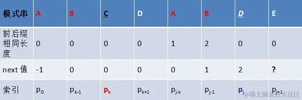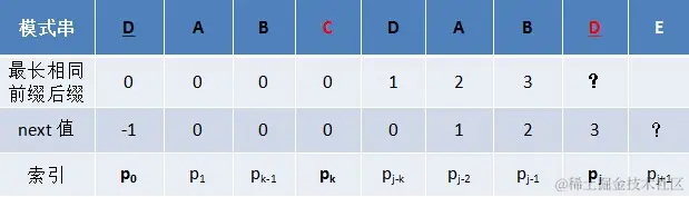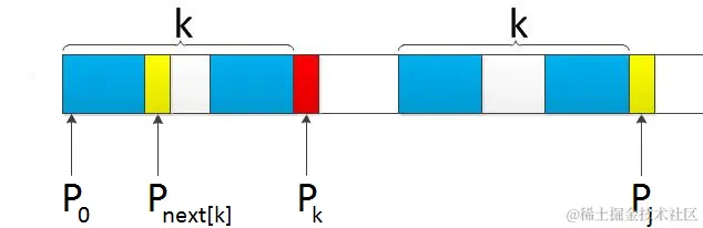 - 之前本应是pj跟si匹配,结果失配了,失配后,令pk跟si匹配,相当于j 变成了k,模式串向右移动j - k位。