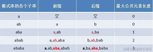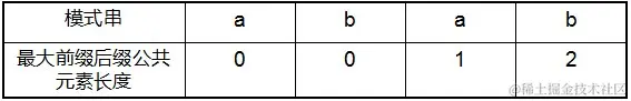 - 对于P = p0 p1 ...pj-1 pj,寻找模式串P中长度最大且相等的前缀和后缀。如果存在p0 p1 ...pk-1 pk = pj- k pj-k+1...pj-1 pj,那么在包含pj的模式串中有最大长度为k+1的相同前缀后缀。举个例子,如果给定的模式串为“abab”,那么它的各个子串的前缀后缀的公共元素的最大长度如下表格所示: