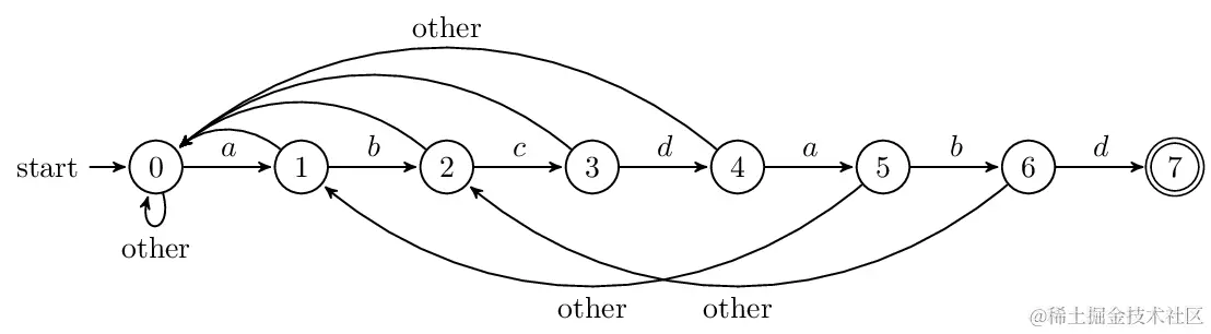 next 负责把模式串向前移动,且当第j位不匹配的时候,用第next[j]位和主串匹配,就像打了张“表”。此外,next 也可以看作有限状态自动机的状态,在已经读了多少字符的情况下,失配后,前面读的若干个字符是有用的。