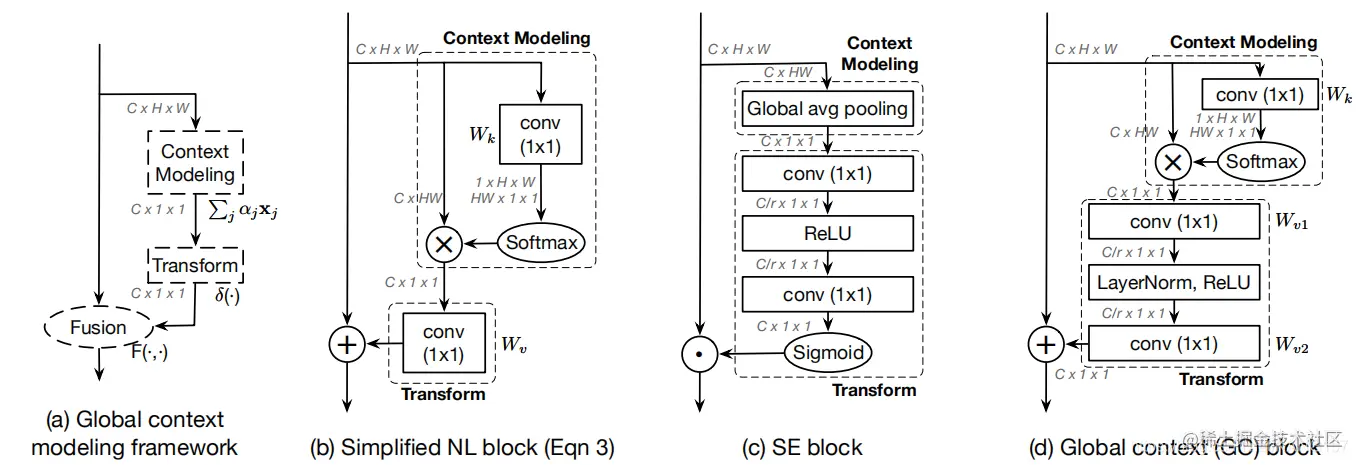 GCNet将SE中的全局平均池化用简化版的Non-Local来代替,而SE下方的结构用了Bottleneck来进行transform。这里使用Bottleneck是为了减少参数量,其中r取16。