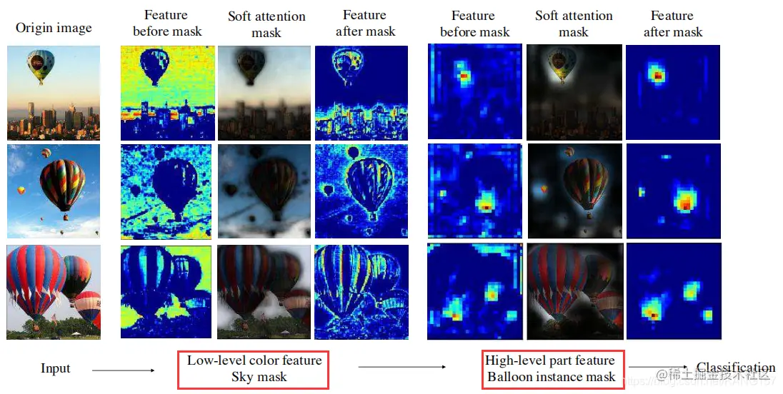 论文提出了残差注意力网络,这是一种在“非常深”的结构中采用混合注意力机制的卷积网络。残差注意力网络由多个注意力模块组成,这些模块会产生注意力感知功能。如下图所示,随着模块的深入,来自不同模块的注意力感知功能会自适应地变化。