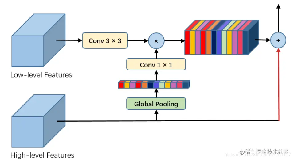 GAU通过全局池化提供的全局信息作为指引选择low-level特征,这是因为high-level中有着丰富的语义信息,这可以帮助引导low-level的选择,从而达到选择更为精准的分辨率信息。