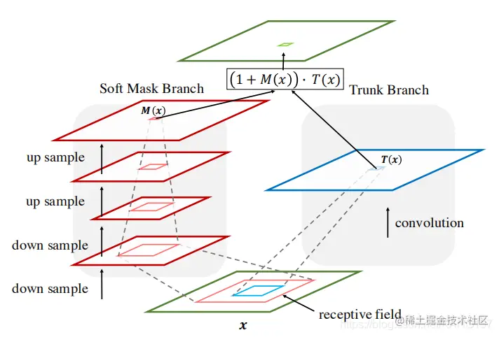 注意力模块由两条分支组成,一个是Soft Mask Branch,一个是Trunk Branch。