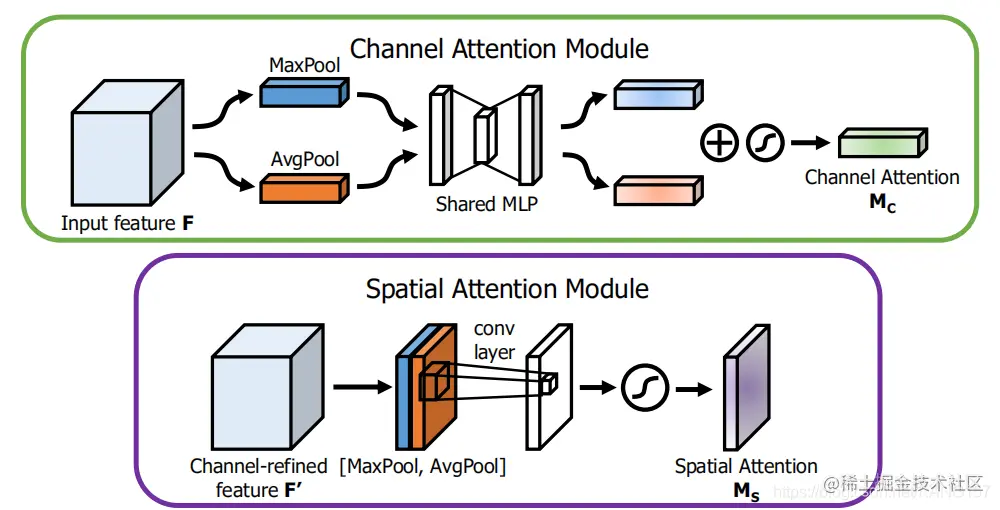 通道注意力的生成方式:先在feature maps上进行全局最大池化和全局平均池化得到两个1维向量,再经过共享的MLP层,再进行相加,sigmoid归一化。