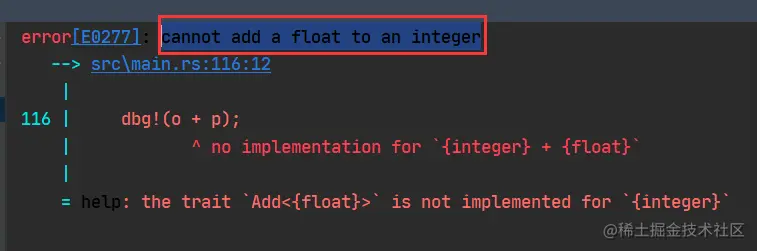 cannot add a float to an integer,不能把浮点数加到整数上。在Rust中不会帮你隐式的转换格式。