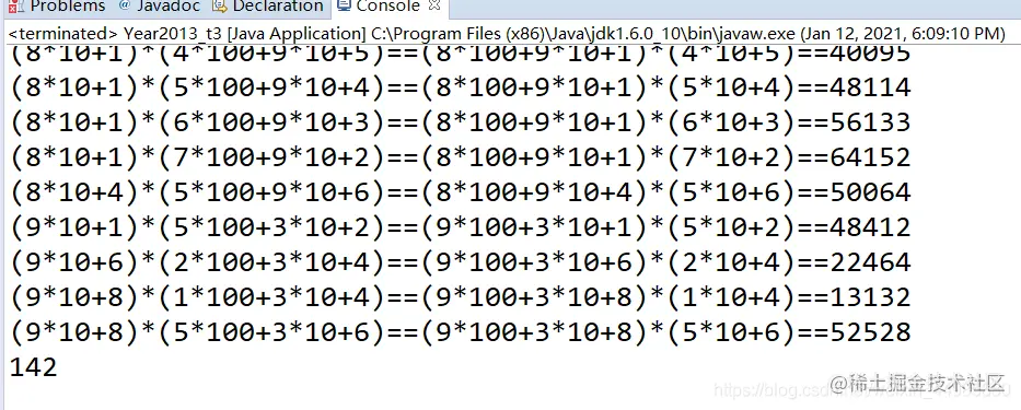 package 一三年省赛真题; public class Year2013_t3 { /** * 假设 a b c d e 代表1~9不同的5个数字(注意是各不相同的数字,且不含0) 能满足形如:ab * cde = adb * ce 这样的算式一共有多少种呢? * */ public static void main(String[] args) { int count = 0; for (int a = 1; a < 10; a++) { for (int b = 1; b < 10; b++) { if (a!=b) { for (int c = 1; c < 10; c++) { if (c!=a&&c!=b) { for (int d = 1; d < 10; d++) { if (d!=a&&d!=b&&d!=c) { for (int e = 1; e < 10; e++) { if (e!=a&&e!=b&&e!=c&&e!=d) { int x = (a*10+b)*(c*100+d*10+e); int y = (a*100+d*10+b)*(c*10+e); if (x==y) { count++; System.out.printf("(%d*10+%d)*(%d*100+%d*10+%d)==(%d*100+%d*10+%d)*(%d*10+%d)==%d\n",a,b,c,d,e,a,d,b,c,e,x); } } } } } } } } } } System.out.println(count); } }