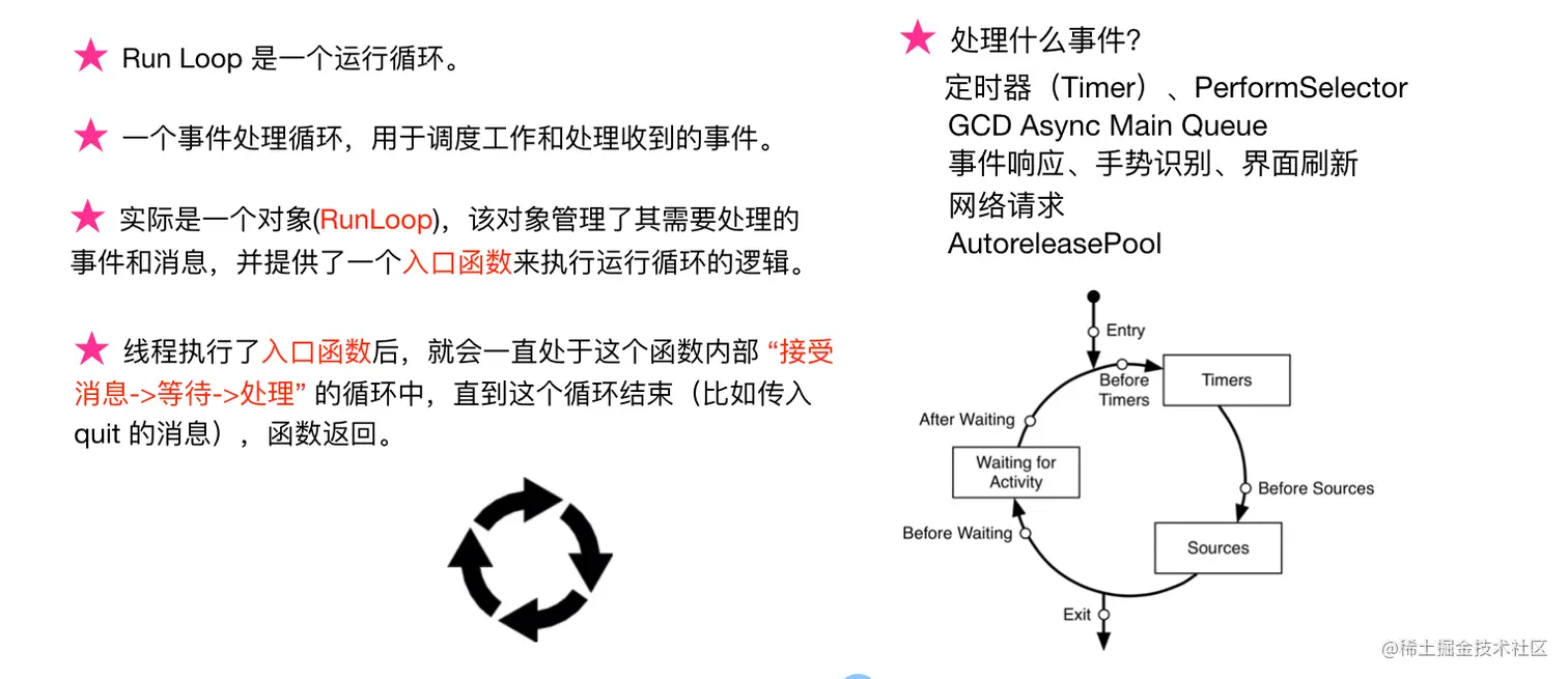RunLoop是iOS/macOS下的事件循环机制,在OC编码实现上,它又是一个对象,该对象管理了其需要处理的时间和消息,并提供了一个入口函数来执行。