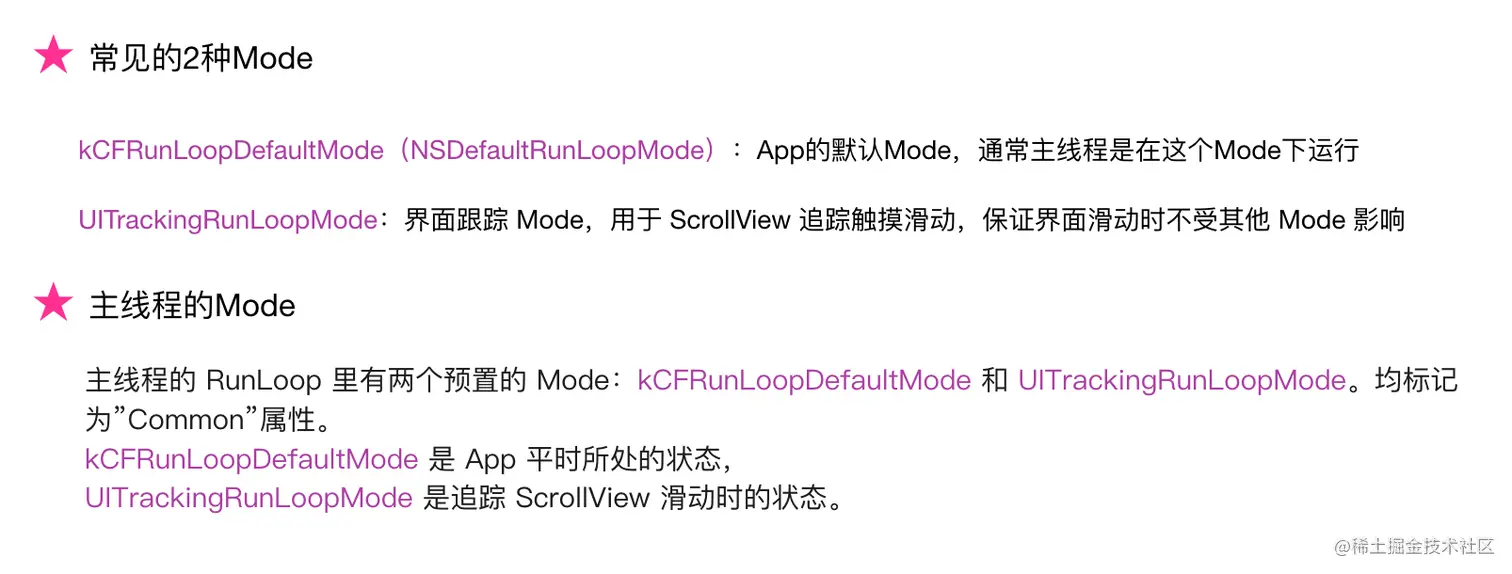 苹果公开提供的 Mode 有两个:kCFRunLoopDefaultMode (NSDefaultRunLoopMode) 和 UITrackingRunLoopMode,你可以用这两个 Mode Name 来操作其对应的 Mode。