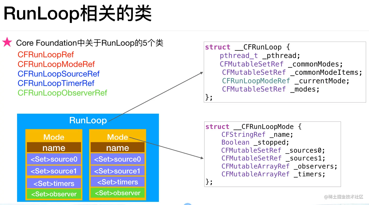 RunLoop运行循环的模式,CFRunLoopRef是RunLoop对象本身,CFRunLoopModeRef是RunLoop当前的一个运行模式。 - 蓝色:需要RunLoop处理的消息类型,包括Source和timer。