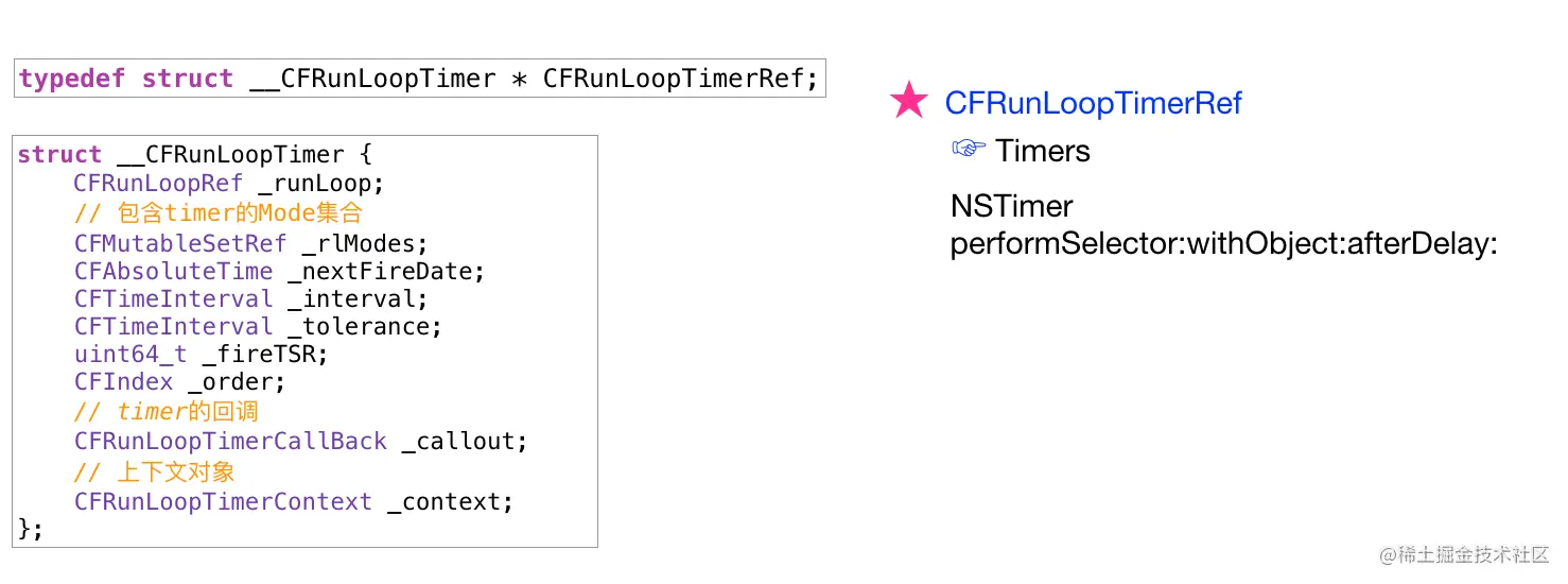 CFRunLoopTimerRef是基于时间的触发器,它和 NSTimer 是toll-free bridged 的,可以混用。其包含一个时间长度和一个回调(函数指针)。当其加入到 RunLoop 时,RunLoop会注册对应的时间点,当时间点到时,RunLoop会被唤醒以执行那个回调。