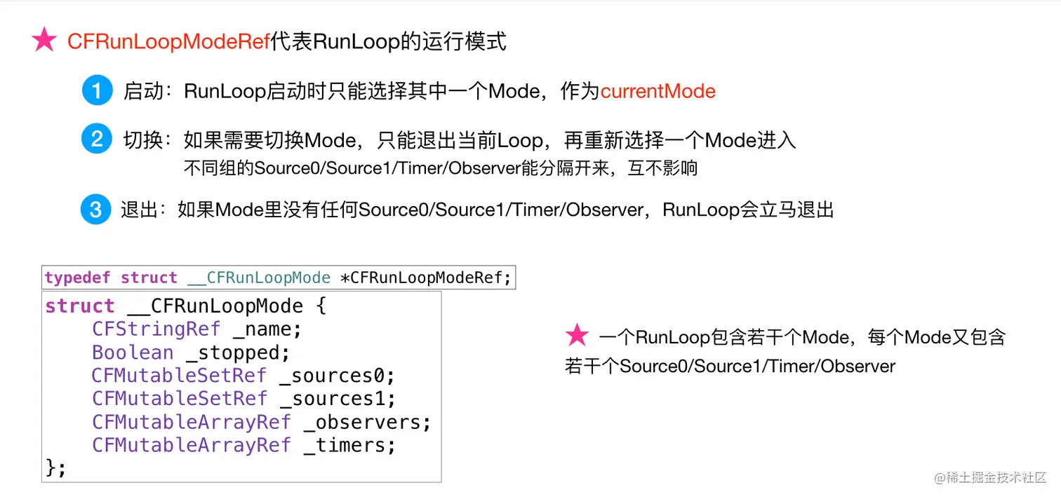 Mode表示RunLoop的运行模式,其CF对象CFRunLoopModeRef。