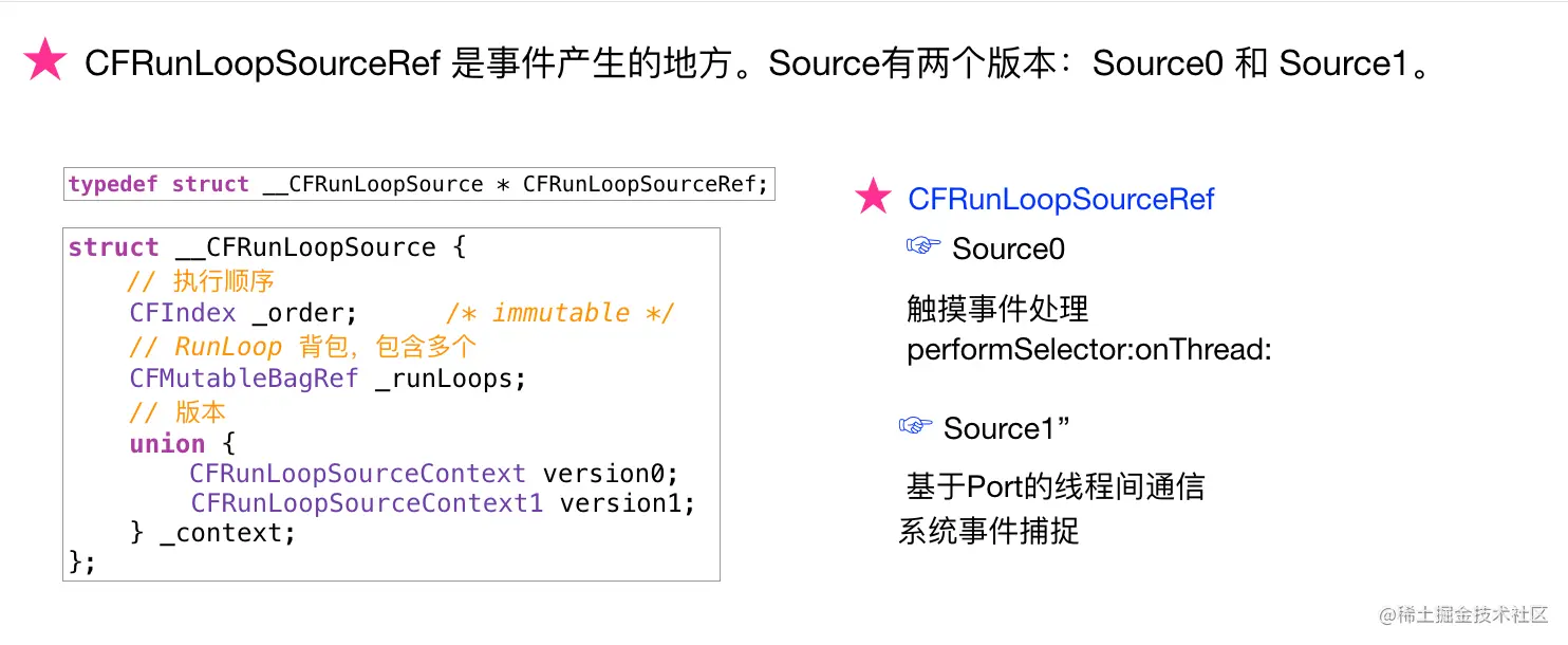 - Source0 只包含了一个回调(函数指针),它并不能主动触发事件。使用时,你需要先调用 CFRunLoopSourceSignal(source),将这个 Source 标记为待处理,然后手动调用 CFRunLoopWakeUp(runloop) 来唤醒