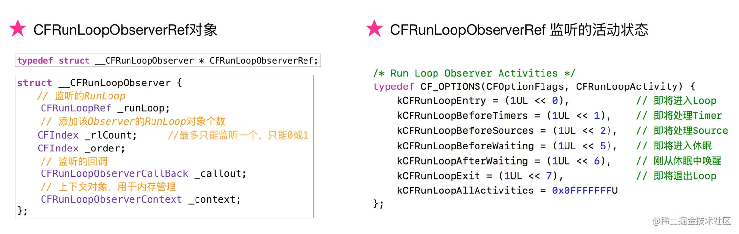 CFRunLoopObserverRef 是观察者,每个 Observer 都包含了一个回调(函数指针),当 RunLoop 的状态发生变化时,观察者就能通过回调接受到这个变化。