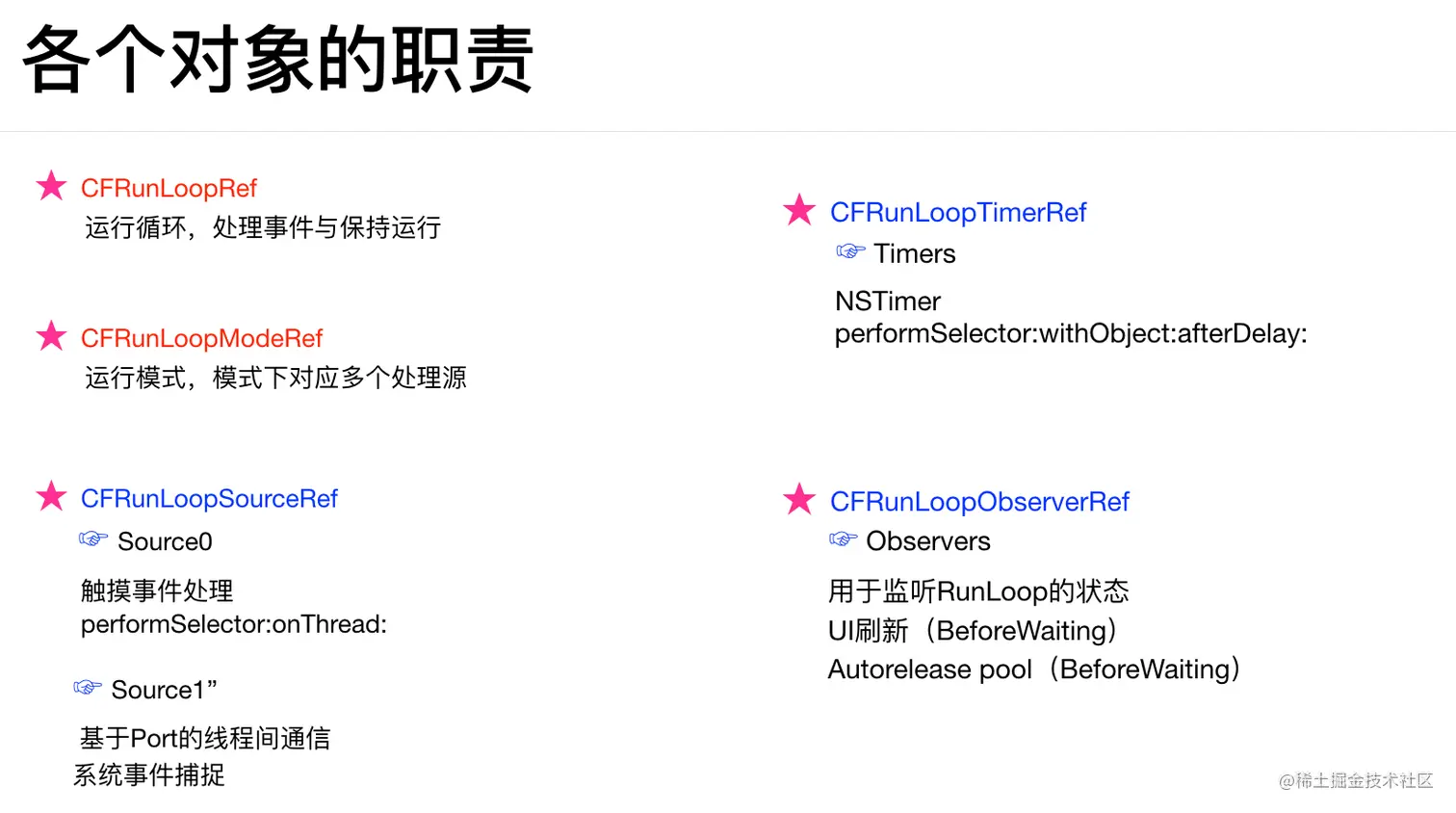 同时苹果还提供了一个操作 Common 标记的字符串:kCFRunLoopCommonModes (NSRunLoopCommonModes),你可以用这个字符串来操作 Common Items,或标记一个 Mode 为 “Common”。使用时注意区分这个字符串和其他 mode name。