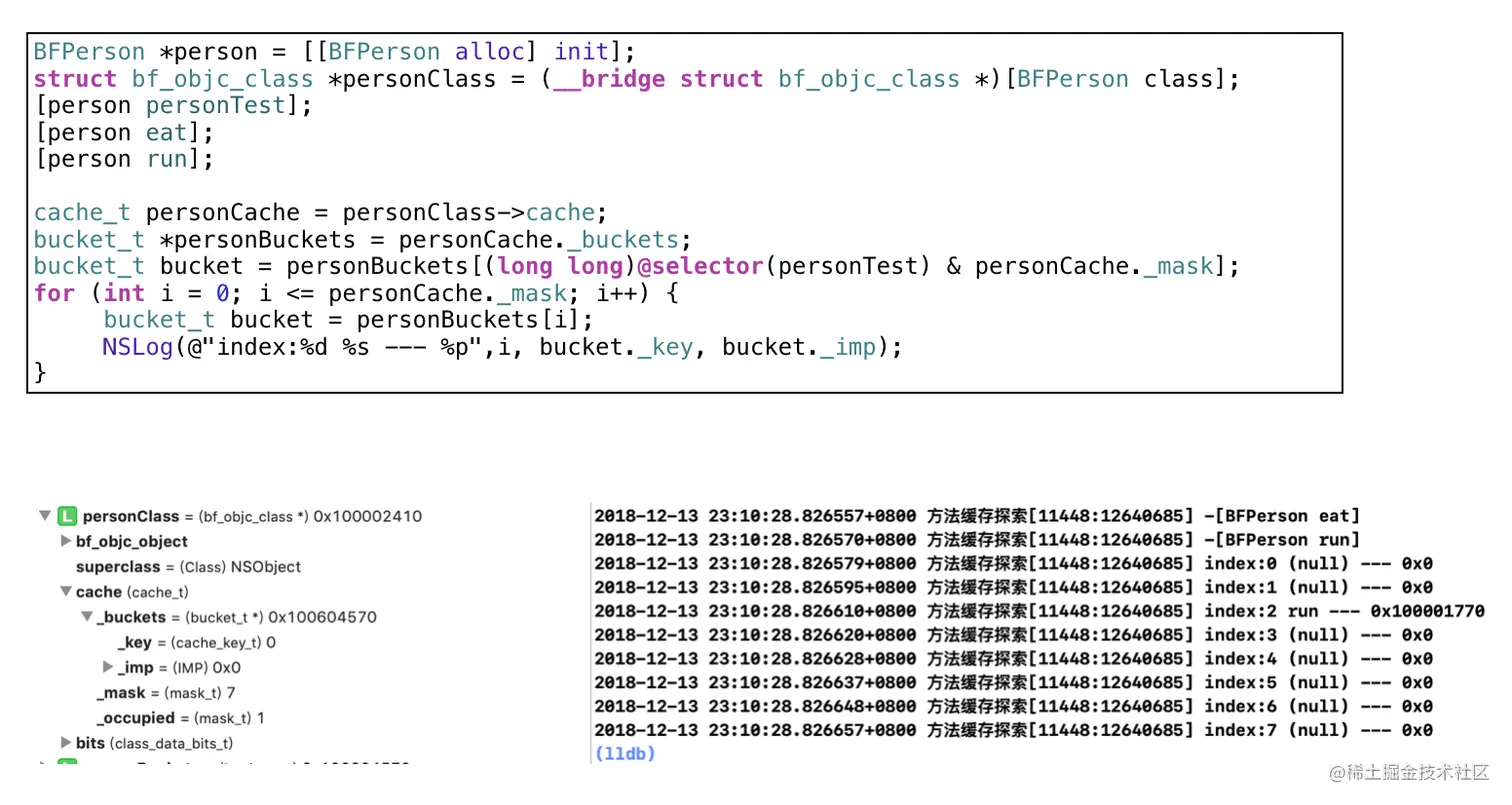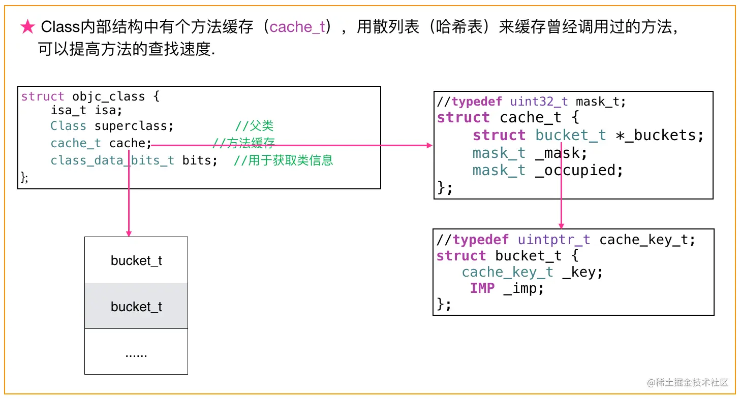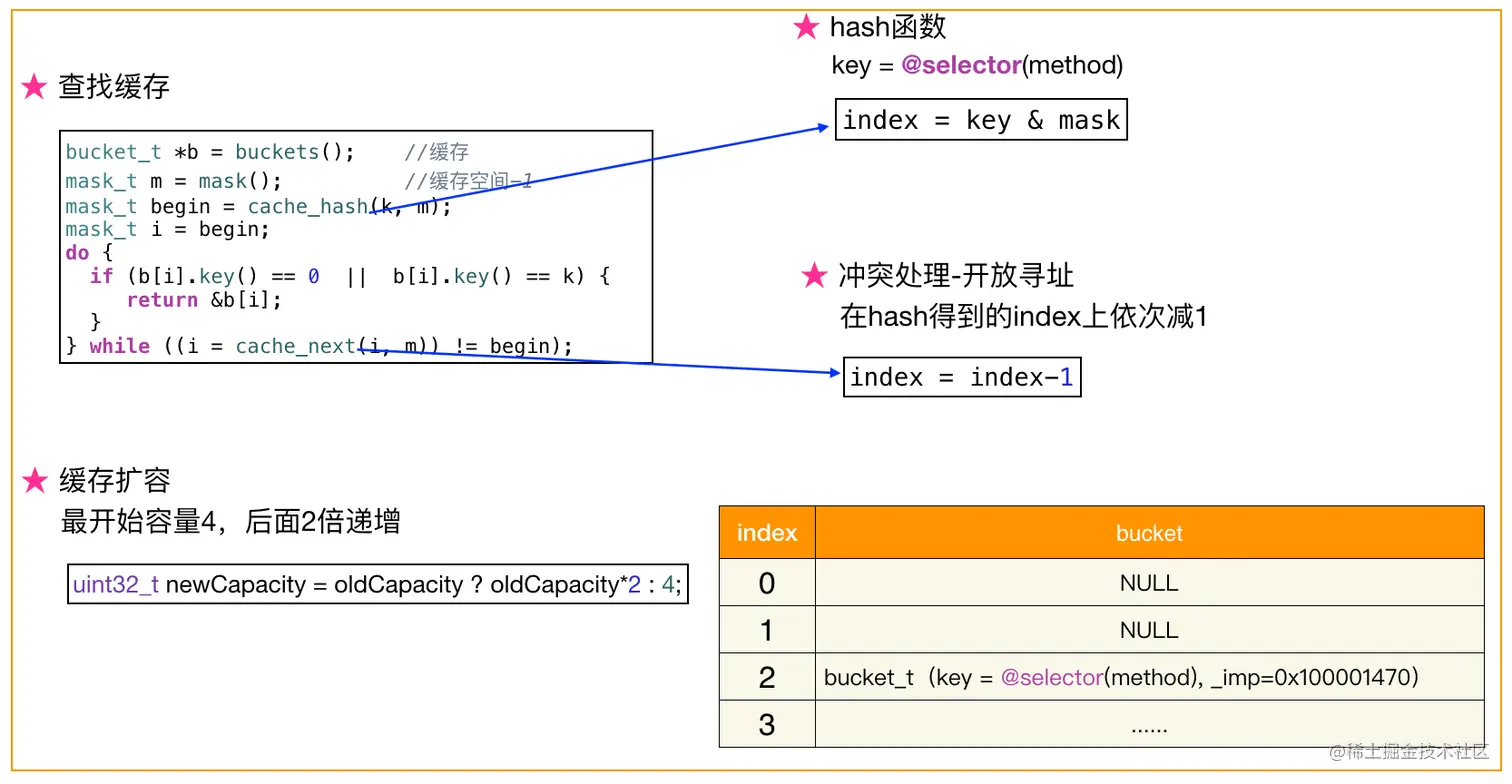 - cache本质是哈希表,其hash函数为:f(@selector()) = @selector() & _mask;