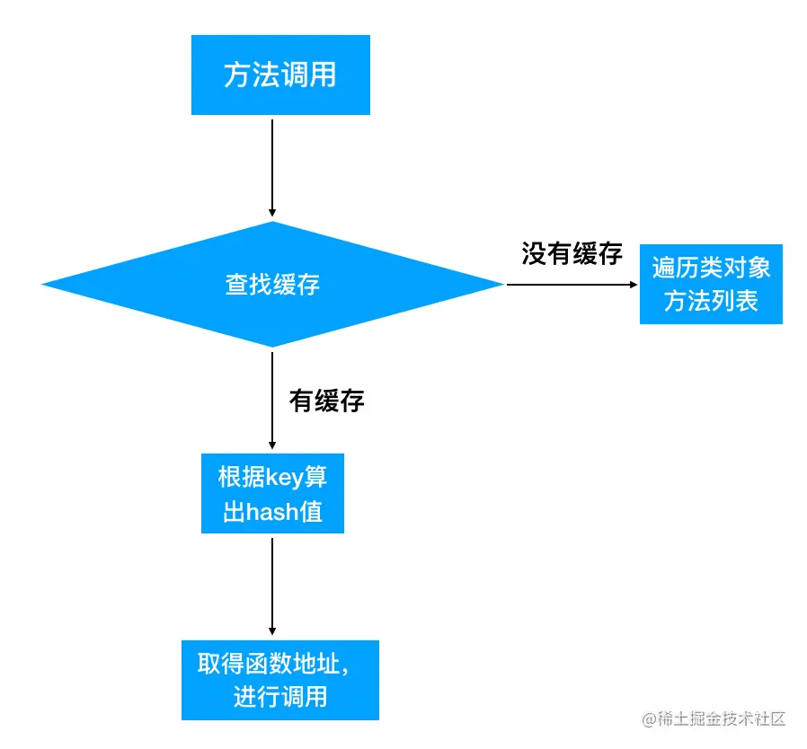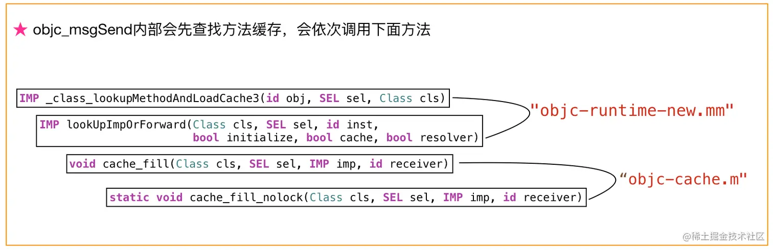 - 子类没有实现方法会调用父类的方法,并且将父类方法加入到子类自己的cache 里。