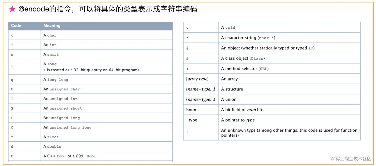 types来声明该方法的返回值及参数,用于底层调用实现的校验。 SEL是方法名。