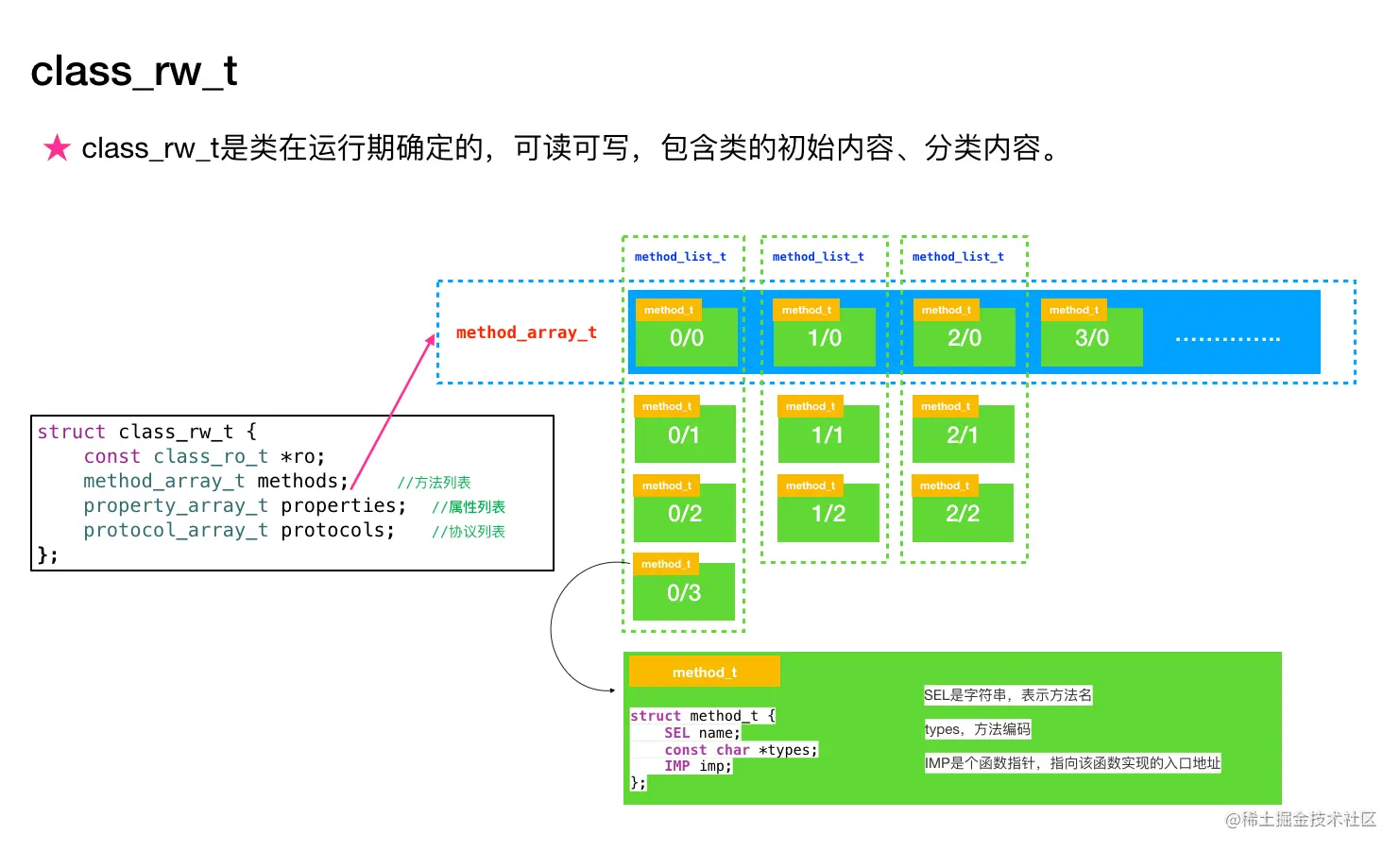 根据上面的class_rw_t结构,我们可以清晰的观察到,在底层中方法的结构体是method_t,即一个方法对应一个method_t。
