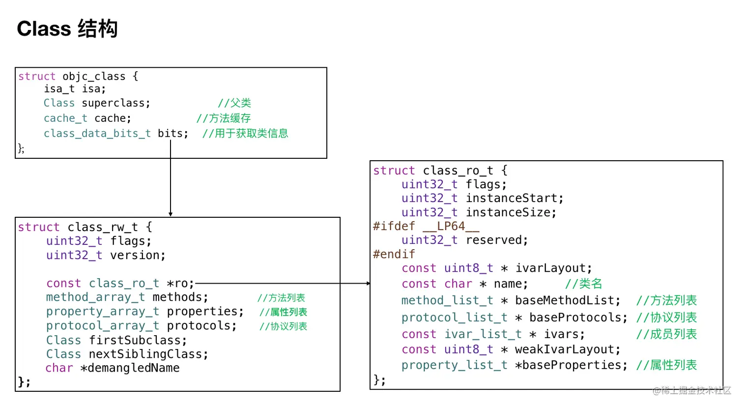 以上是在运行时使用到类的最终结果,那么在编译期,其实在之前的文章中也有提到,类结构略有不同,主要在于bits里指向的是class_ro_t,而非class_rw_t。