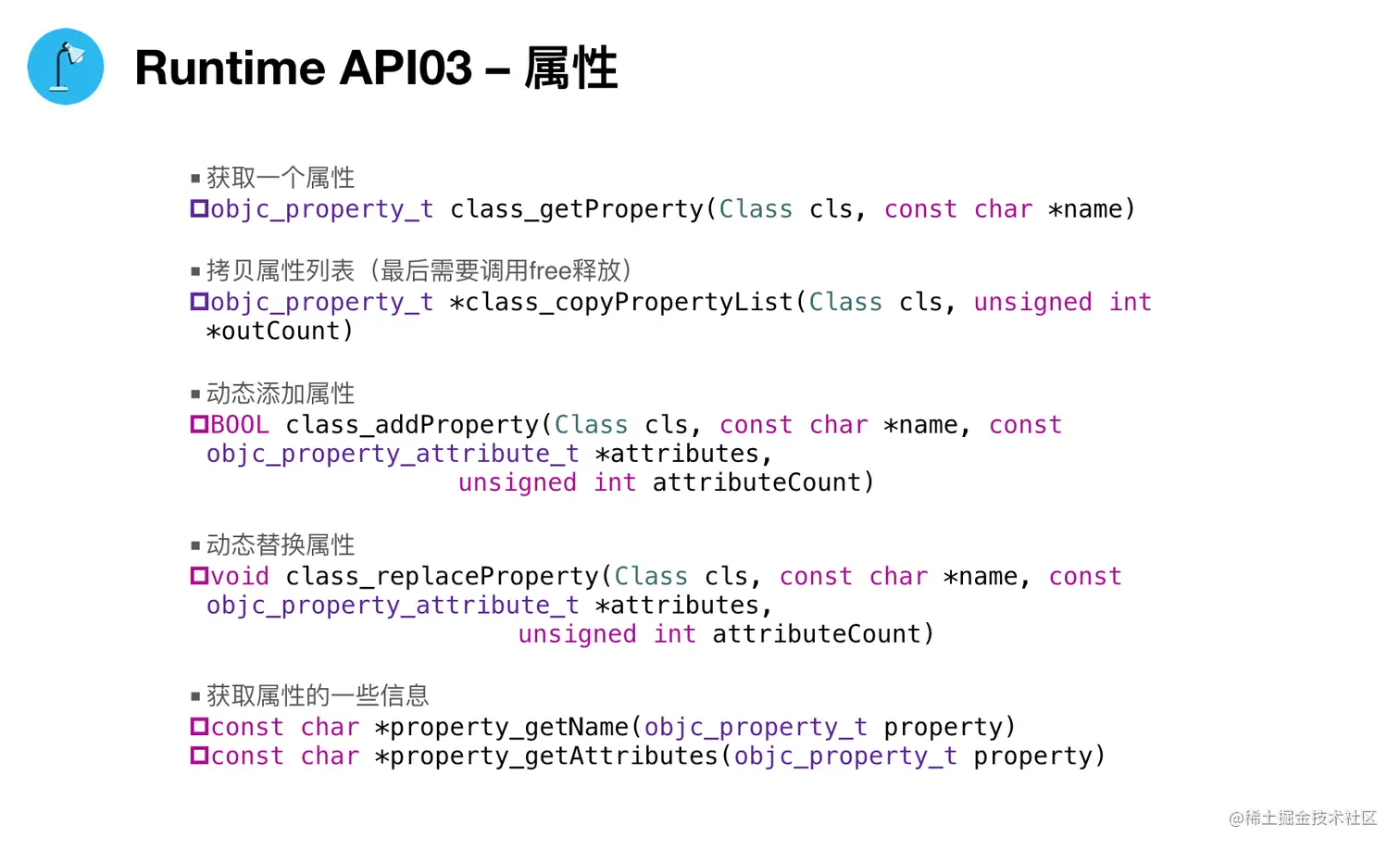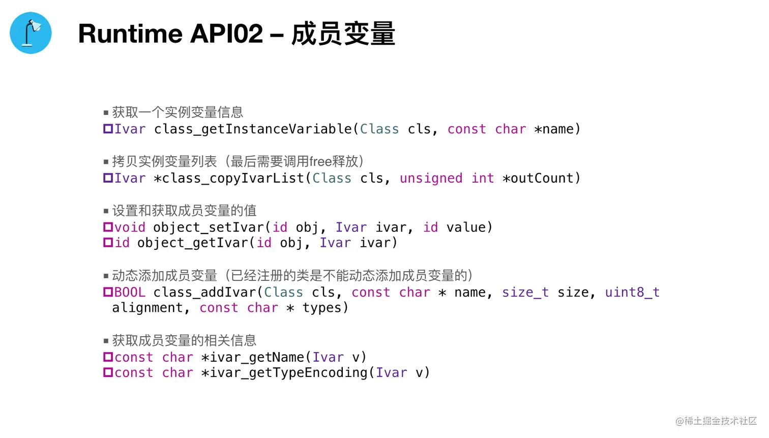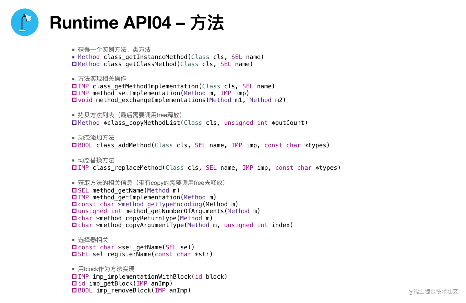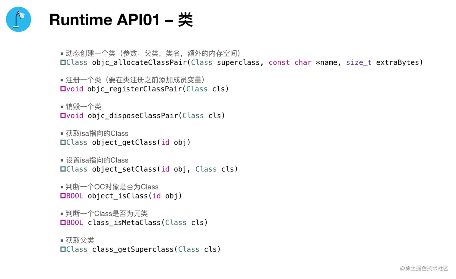 Runtime(六)API与应用 wenghengcong 2021-06-30 215 阅读1分钟 Runtime的剖析,到这一篇就进入尾声了。 最后我们总结了Runtime的API,及其在开发中的应用。 一、API 1. 类 2. 成员变量 3. 属性 4. 方法