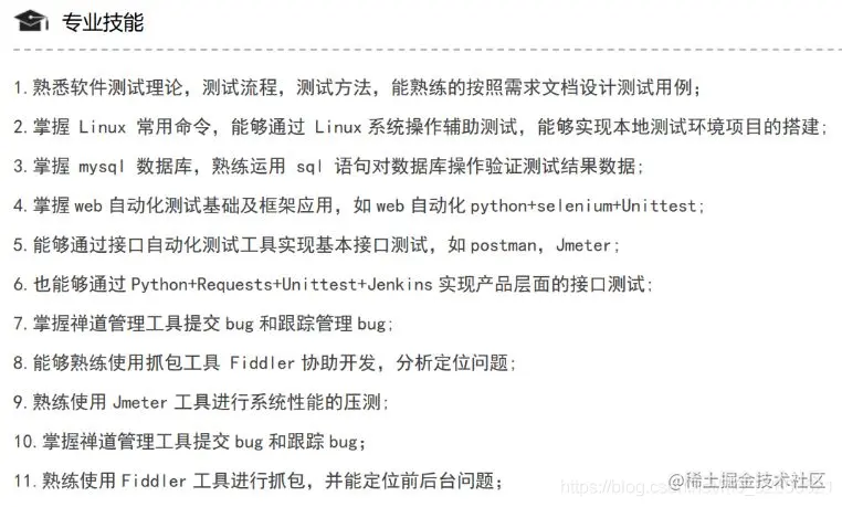 2.在描述运用核心技能时,最好也能通过具体案例描述分析定位解决问题的能力(比如过程中遇到过影响较深的bug,你是如何分析定位,最后如何协助研发解决等过程,当然你列举的例子具有一定深度,不是一般的bug)