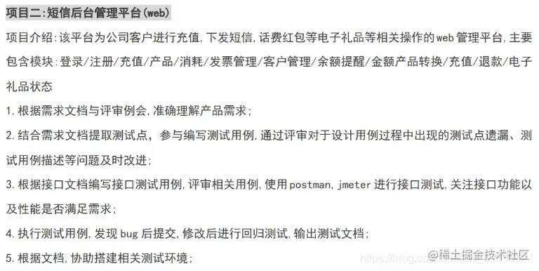 项目经验包含的核心内容有:项目的基本介绍,干什么用的/提供什么服务?项目的用户是谁?项目包含的核心模块?项目对应的核心技术栈?本人(作为测试工程师)如何在项目中开展工作(即如何测试设计和实现测试的过程)。