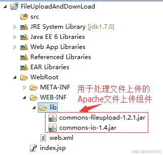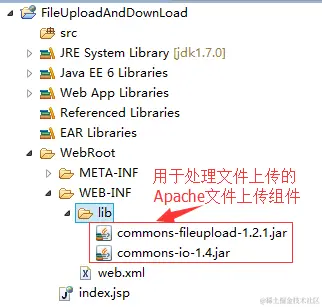 创建一个FileUploadAndDownLoad项目,加入Apache的commons-fileupload文件上传组件的相关Jar包,如下图所示: