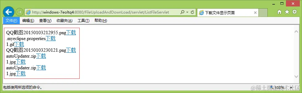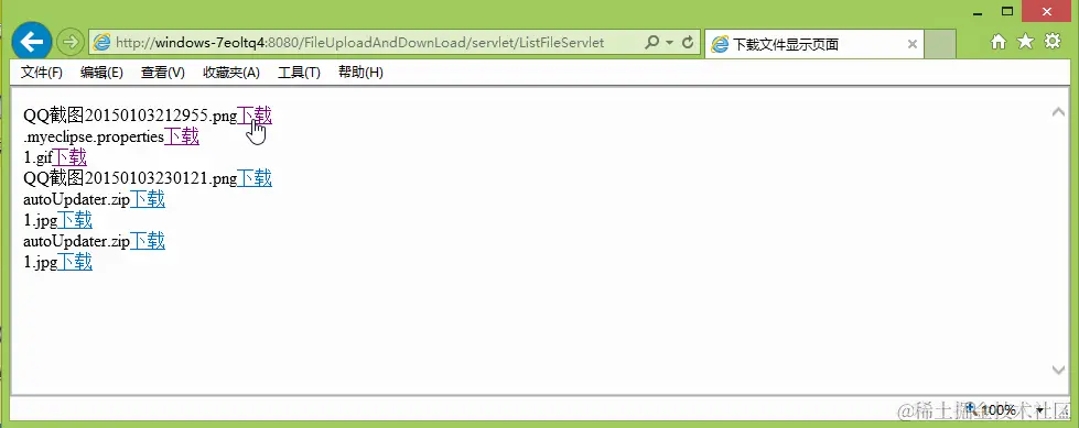 访问ListFileServlet,就可以在listfile.jsp页面中显示提供给用户下载的文件资源,如下图所示: