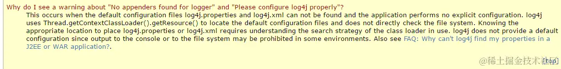 其实也还蛮简单的 大致上就是说log4j的配置文件没有找到并且应用程序执行的时候没有显示配置,而log4j呢,是依靠Thread.getContextClassLoader().getResource() 这两个类去定位文件的默认信息而不是直接去查他的文件系统,而你要将log4j放在合适的位置就需要知道类装入器(class loader大致是这么个理)的搜索策略,log4j没有提供一个默认的配置不管是输入到控制台还是到文件系统中,不过也可能在某些环境中被禁止。哔哔了半天,就是和文章开头我言简意赅的解释一样