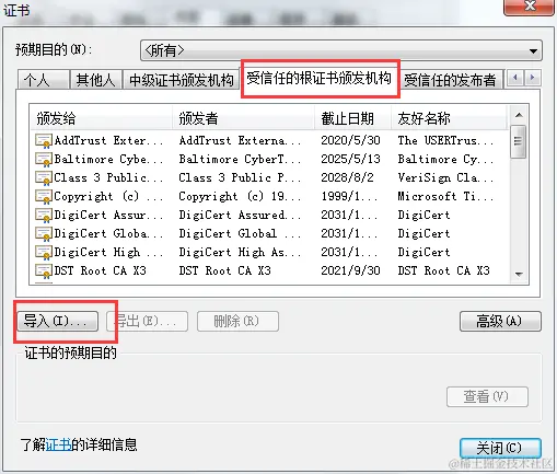 选择"受信任的根证书颁发机构" ----> 导入证书