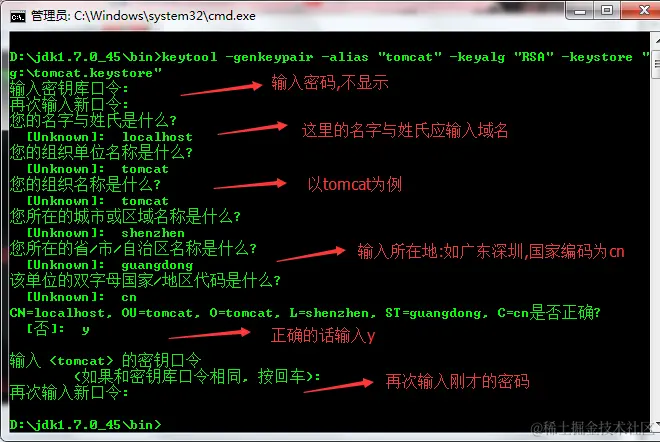 以上命令将生产一对非对称密钥和自我签名的证书g:\tomcat.keystore
