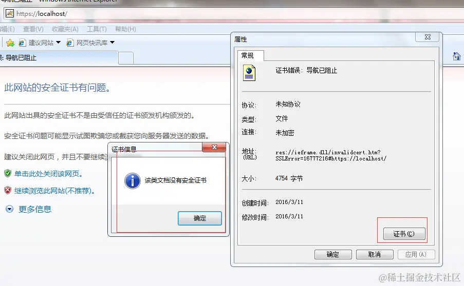 在浏览器中右击选择属性, 查看不到证书
