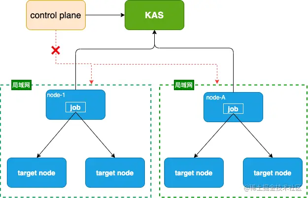 云端管控平面无法直接连接边缘节点,现有的解决方案是搭建跳板机访问内网节点,边缘节点可能处于不同的内网中,在每个内网环境都搭建跳板,会带来额外的机器资源的开销和运维人员的工作量。在云端管控平面可以连接用户集群的 apiserver 的情况下,可以在管控平面向用户集群的 apiserver 下发一个添加节点的 job,job被调度到集群内的一个节点执行,具体实现如下图所示: