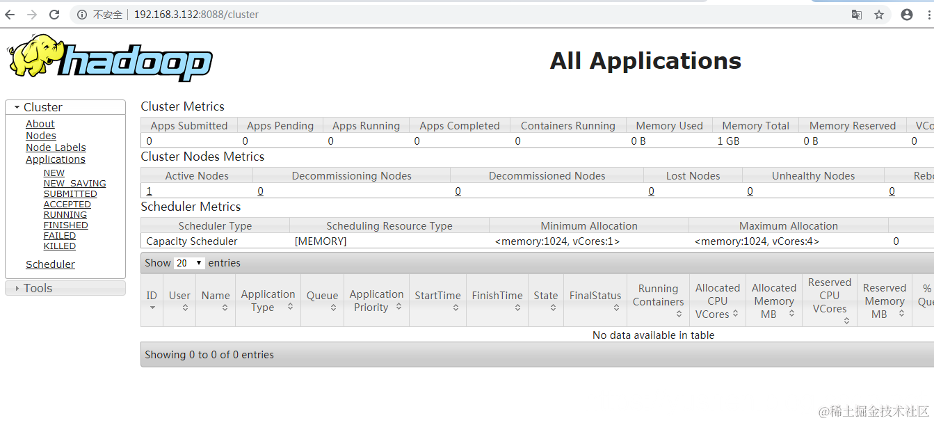 接下来访问hadoop管理首页,hserver1的IP是192.168.3.132,因此访问:
