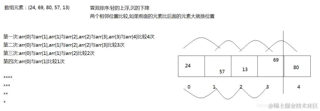 相邻元素两两比较,大的往后放,第一次完毕,最大值出现在了最大索引处