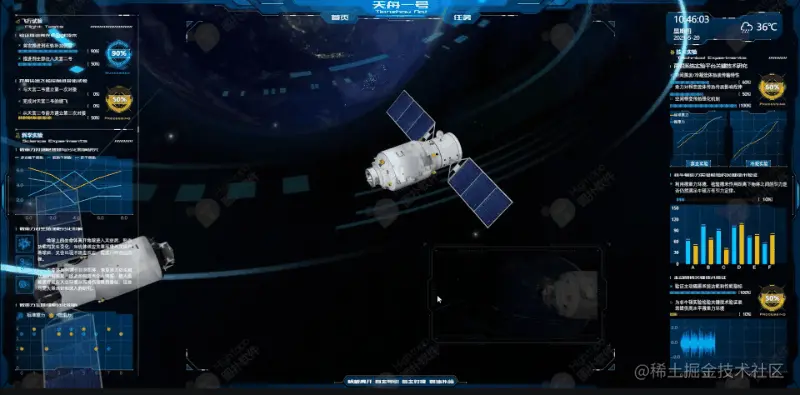 今天将采用 Hightopo 的产品 HT 搭建 “天舟一号”货运飞船数字孪生管理系统。HT 三维仿真技术可多维度直观展示飞船主体、运载信息、飞行试验、技术实验、运行历程等重点管理对象的运行态势,支持全范围空间的态势可视化监控。智慧航天是基于大数据、云计算、人工智能技术的应用平台,它的出现能更加迅速的从海量数据中提取出有效的信息,为智慧决策提供有力支持。