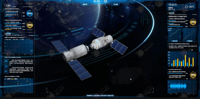 选用 3D 可视化监控平台即可呈现立体的全面的飞船运行实时画面,且支持对接飞船传感器对数据进行实时采集,辅助监测人员通过数据对飞船运行态势、健康状态、预警告警信息等进行快速判断。保证飞船运行轨迹始终处于平稳状态,优化以往传统的操作流程。