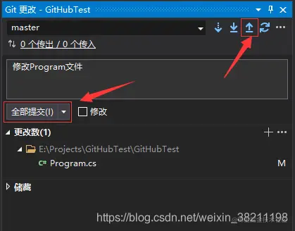 现在修改Program文件并保存,可以看到右边的解决方案资源管理器中的Program文件有红色的勾,表示已经被修改,现在可以右键提交到GitHub