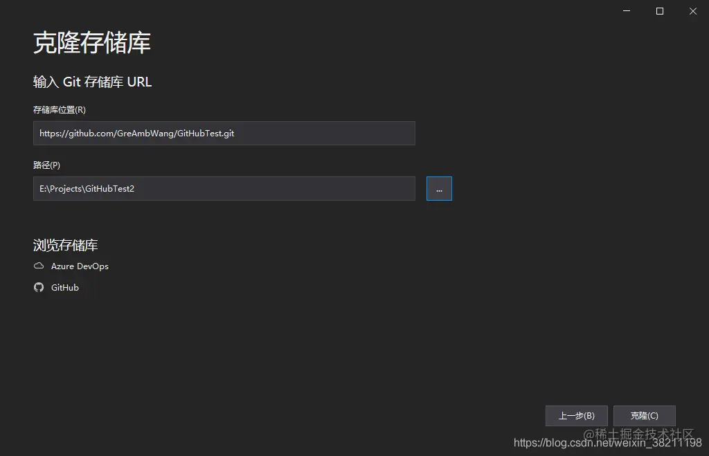 粘贴到输入框中,并在E:\Projects新建文件夹GitHubTest2,点击克隆