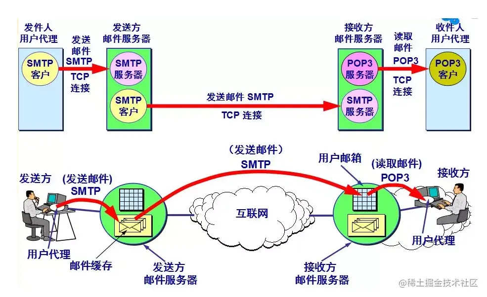 **邮件发送过程:**从发送的用户代理开始,传输邮件到发送方的邮件服务器,再传输到接收方的邮件服务器,然后在这里被分发到接收方的邮箱中。如果用户要读取该邮件时,使用用户名和口令来鉴别用户。