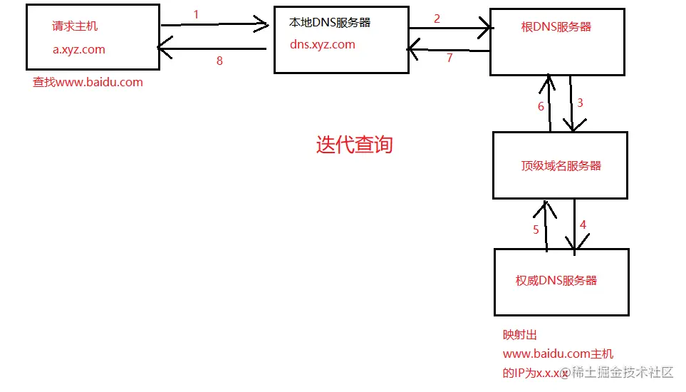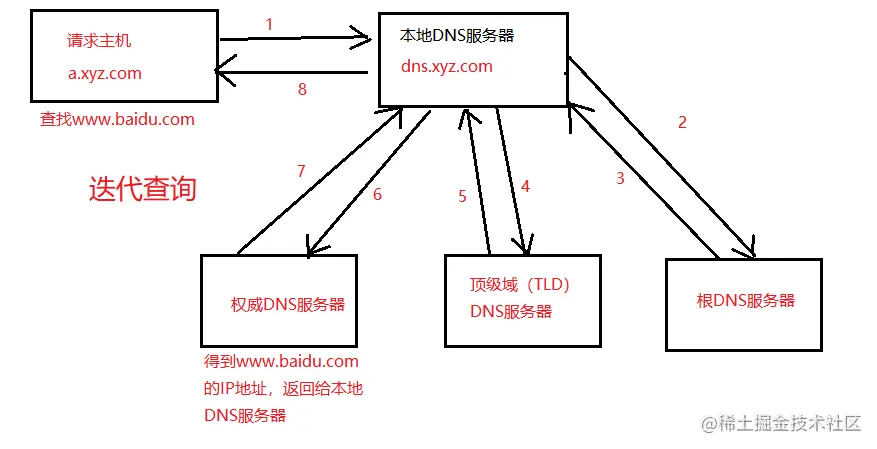 - ==本地域名服务器向根域名服务器的查询通常是采用迭代查询==:当根域名服务器收到本地域名服务器的迭代查询请求报文时,要么给出所要查询的 IP 地址,要么告诉本地域名服务器:“你下一步应当向哪一个域名服务器进行查询”。然后让本地域名服务器进行后续的查询。