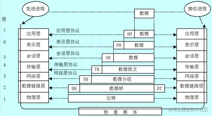 7层OSI参考模型:应用层 ->表示层 -> 会话层 -> 传输层 -> 网络层 -> 数据链路层 -> 物理层