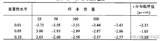在零假设(序列非平稳)下,即使在大样本下统计量也是有偏误的,通常t检验无法使用。Fuller于1976年提出了这一情形下的t统计量服从的分布,即DF分布,DF分布临界值如下表所示: