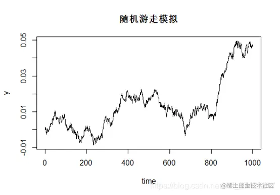 plot(y, type = 'l', xlab = 'time', main = '随机游走模拟')